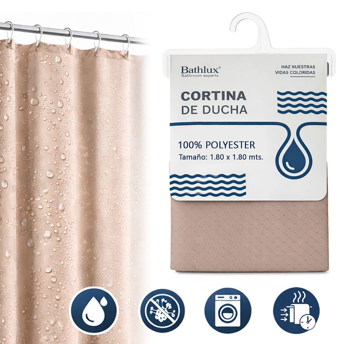 Características principales: Medida: 180 x 180 cm / Material: Tela con tratamiento Teflón / Impermeable / repelente al agua / Anti hongos (ideal para ambientes húmedos) / Fácil de limpiar / Excelente caída y terminación, más elegante que las cortinas plásticas