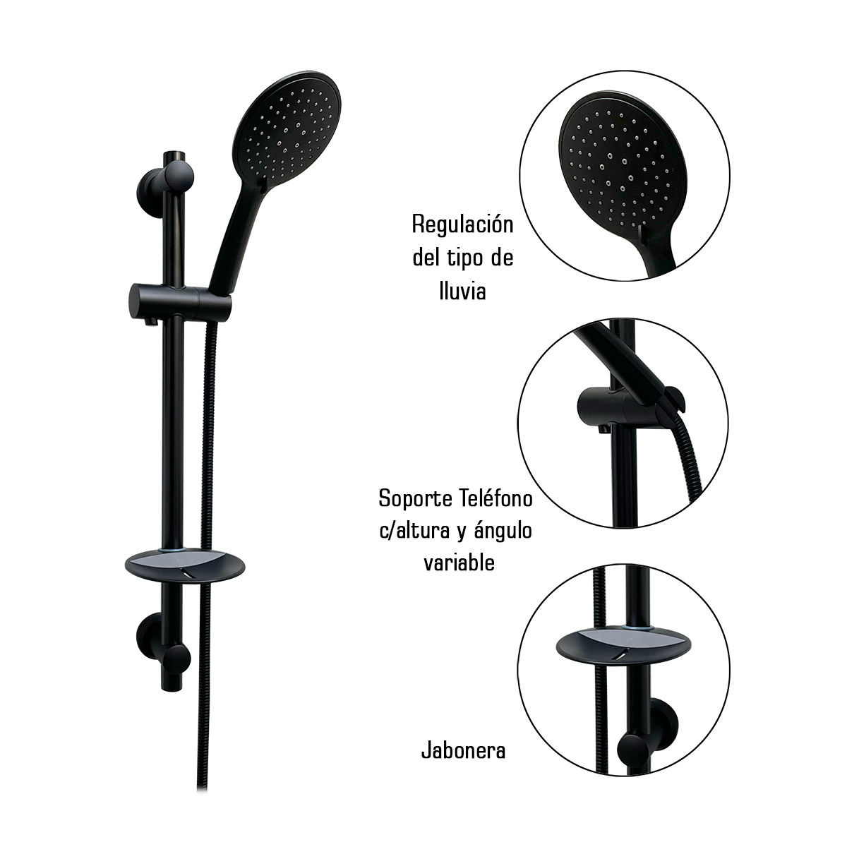 Panel columna de ducha, con altura y angulo regulable. Incluye soporte, manguera flexible de acero, y jabonera con rejilla. Producto fabricado en plastico en color NEGRO MATE.
