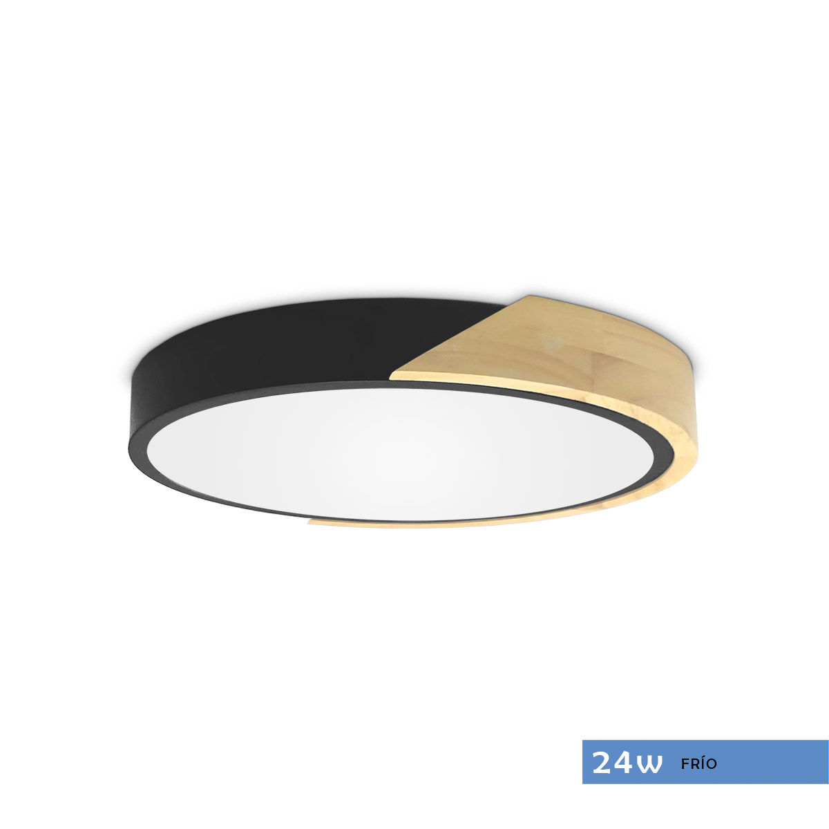 PLAFON de Aplicar en el Techo, PANEL LED 24W de luz Fría. Diseño Nórdico que combina la Madera y el color Negro. Moderno, se puede utilizar en cualquier ambiente de la casa. Luminaria de Adosar, muy sencillo de instalar. La fuente de luz LED de ahorro de energía tiene una larga vida útil de más de 30.000 horas. Artefacto de excelente calidad que cumple con los estándares europeos de fabricación. La mejor luminaria decorativa para interiores.