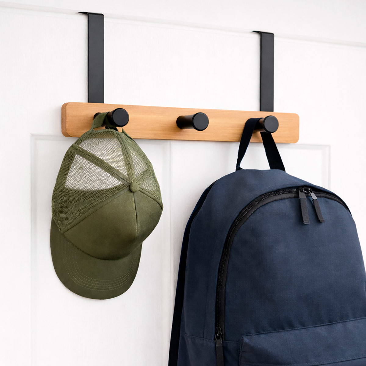 Organizá tus espacios de forma práctica y elegante con este perchero para puerta de 3 ganchos, ideal para dormitorios, baños, cocinas u oficinas. Su diseño combina metal negro con madera natural de bambú, logrando un estilo moderno, cálido y minimalista que se adapta a cualquier ambiente. Se instala sin perforaciones, simplemente colgándolo sobre la puerta, lo que lo convierte en una solución funcional y rápida para mantener todo en orden.