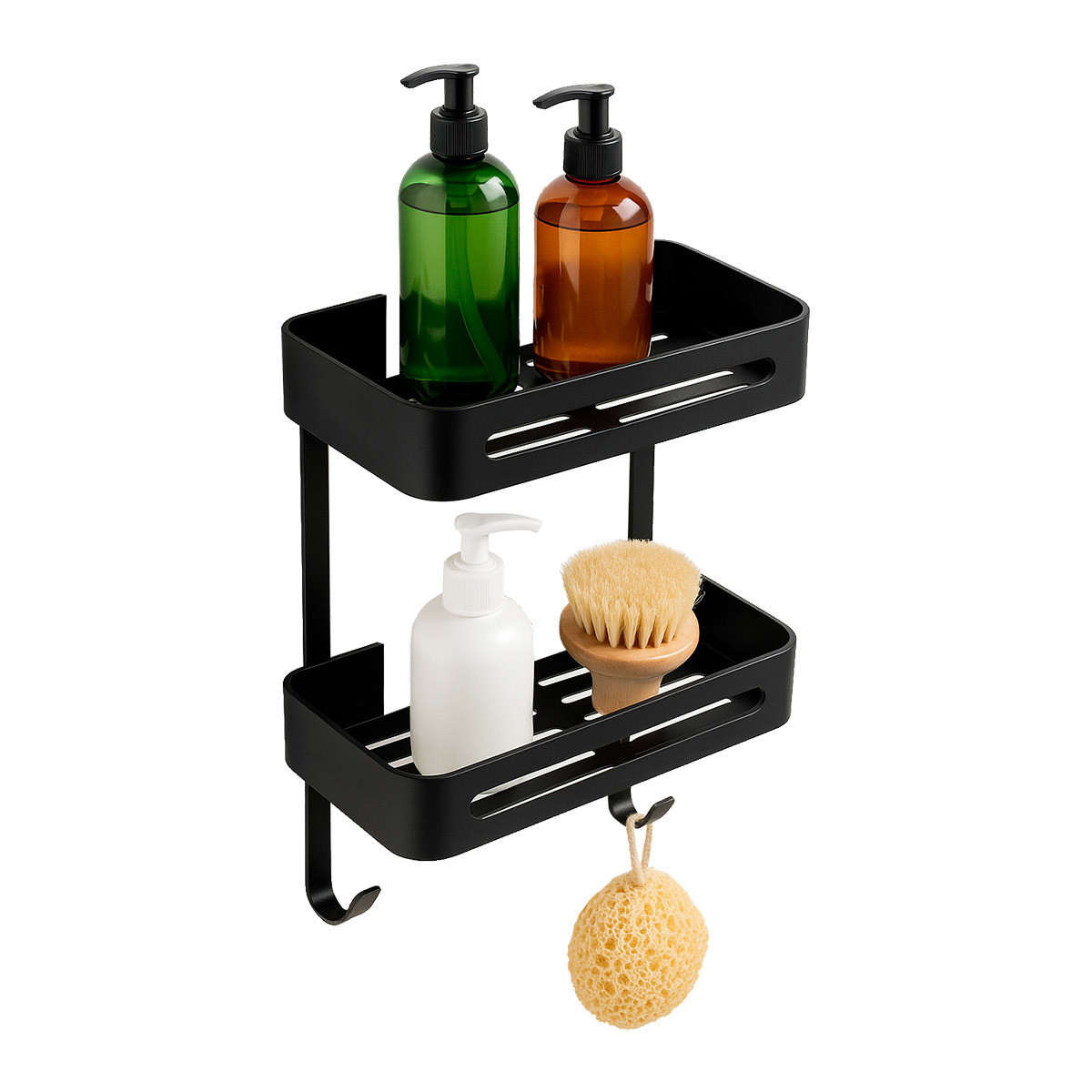 REPISA Estante Recta de dos niveles, con frente suavemente curvado para baño o duchero, estantes perforados para evitar acumulación de agua. Incluye dos ganchos percheros super prácticos. Organizador de ducha. Diseño Industrial y moderno. Práctico y Funcional. Producto fabricado en ALUMINIO, terminación NEGRO MATE. 100% INOXIDABLE. Excelente pieza que recomendamos por su calidad: fuerte,resistente, durable.Sistema simple, seguro y estándar de fijación a la pared con tornillo y taco de amure. Incluye kit de instalación. Este artículo pertenece a la colección de accesorios para baños TORONTO Negro, de la marca Gondomar, de esta forma puedes armar tu baño manteniendo como el mismo criterio de diseño de todo tu baño. Complementos y Accesorios para Baño. Organización. Calidad al precio justo.